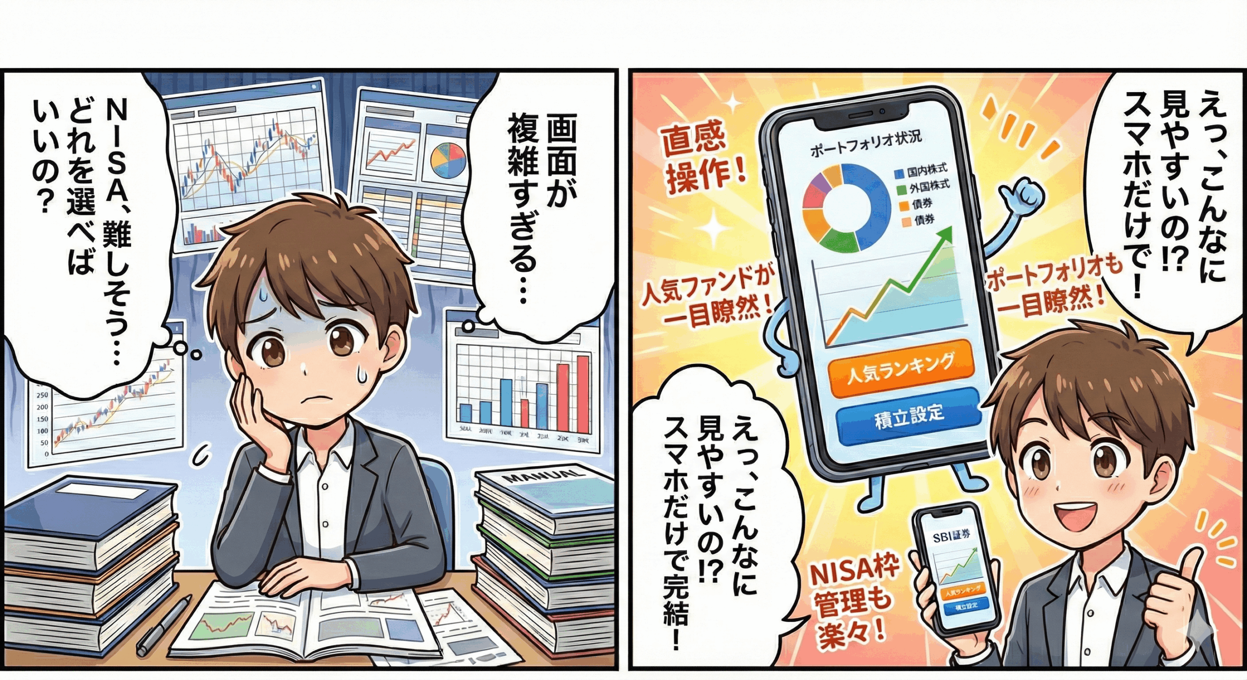 新NISAの証券会社選びで迷っている方へ。SBI証券なら「かんたん積立アプリ」で初心者でも迷わず資産運用が始められます!直感的な操作感、見やすい資産推移、人気ファンドランキングなど、実際のアプリ画面の使い勝手を徹底解説。クレカ積立でポイントも貯まる賢い運用をスマホで始めましょう。